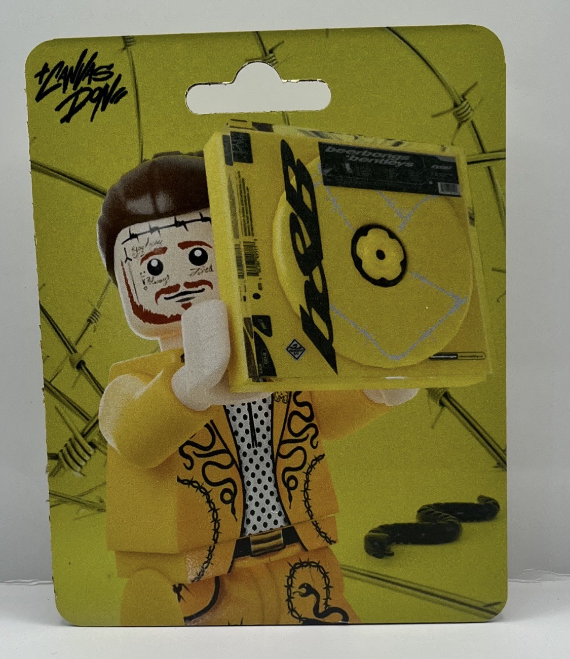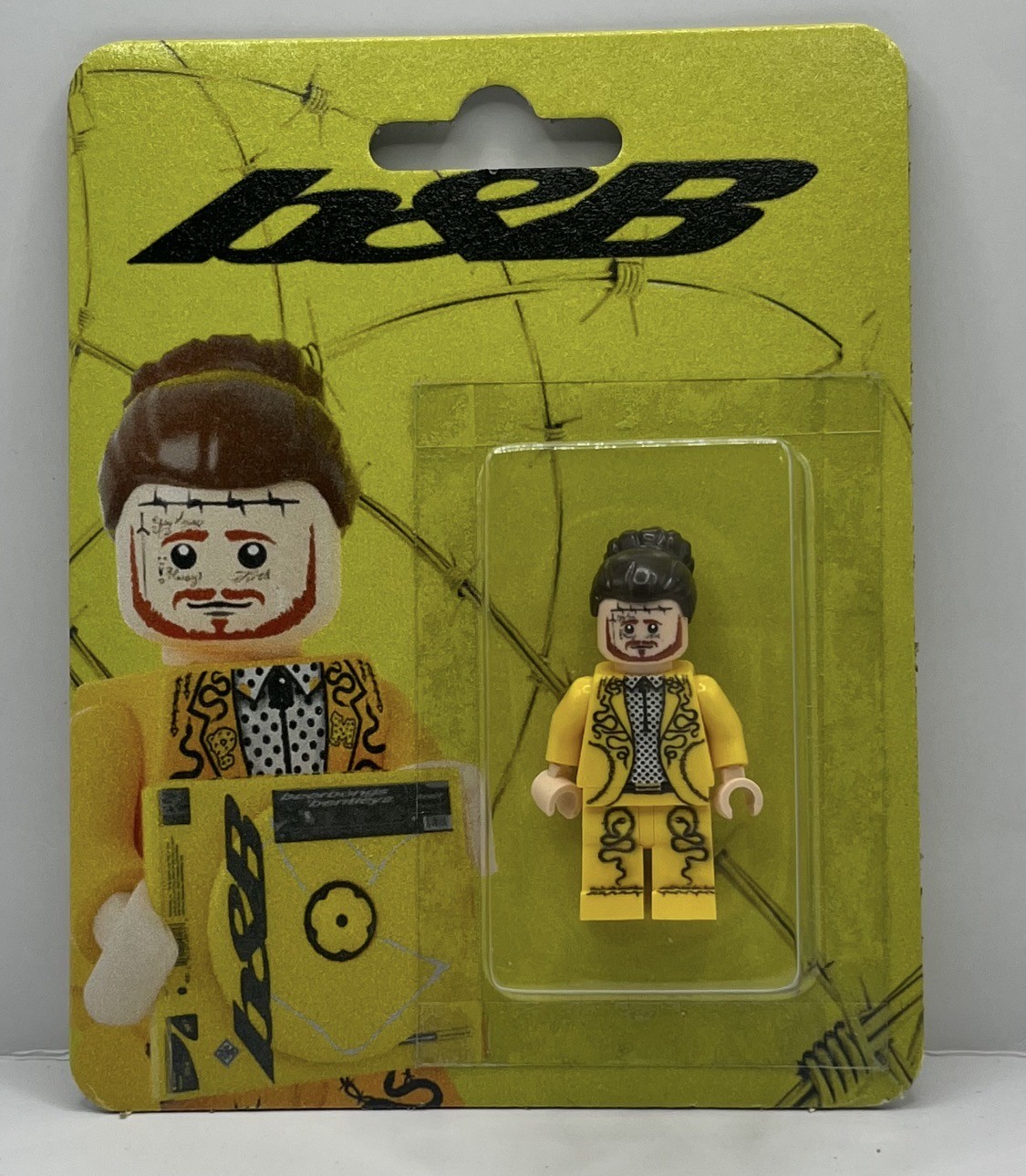 Take your collection to the next level with this ultra-rare "Beerbongs & Bentleys" custom minifigure by The Canvas Don. Capturing Post Malone in his absolute prime, this figure features the legendary bright yellow suit and detailed barbed wire aesthetic that defined the b&b era.